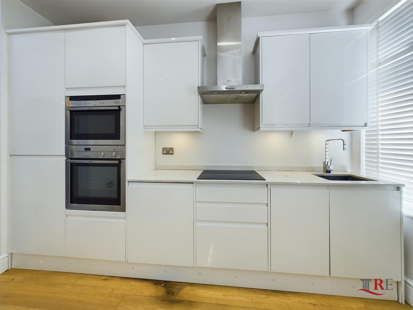 The Kitchen consists of an integrated fridge and freezer, high quality Neff appliances, Induction Stove, and Dishwasher.